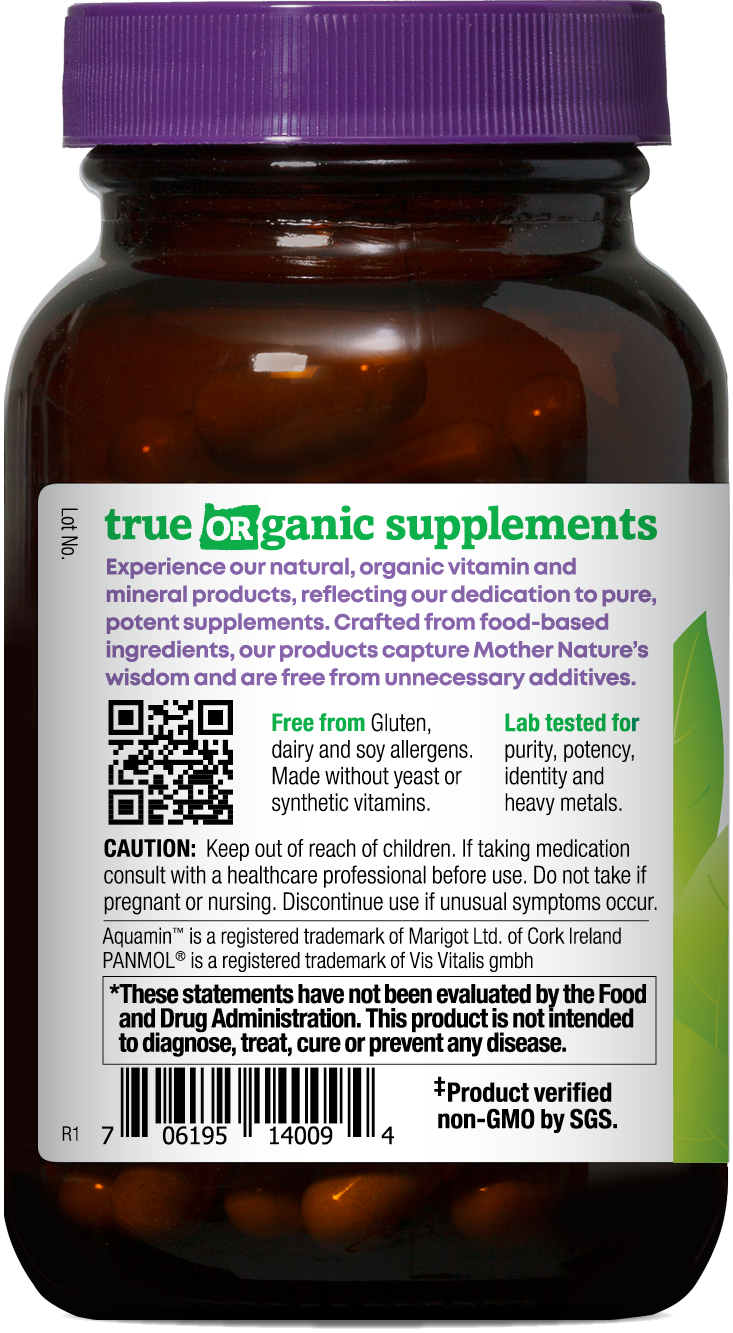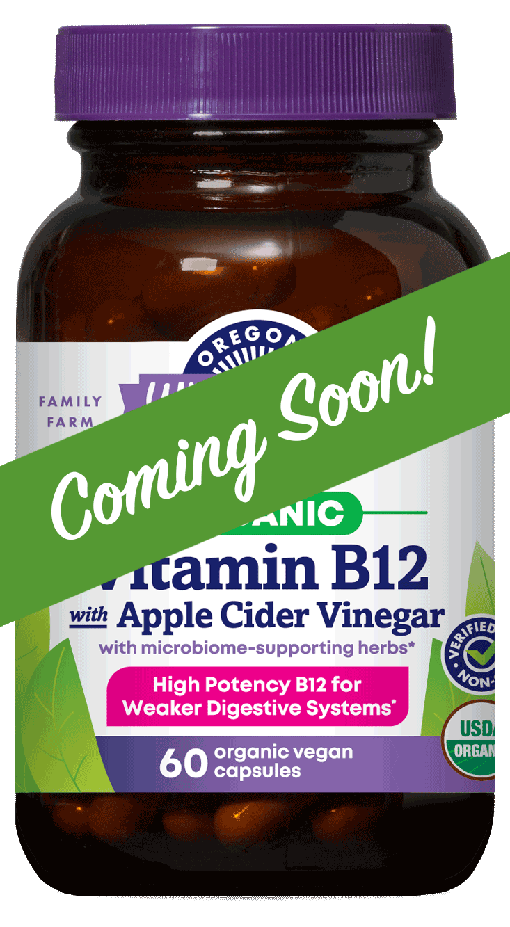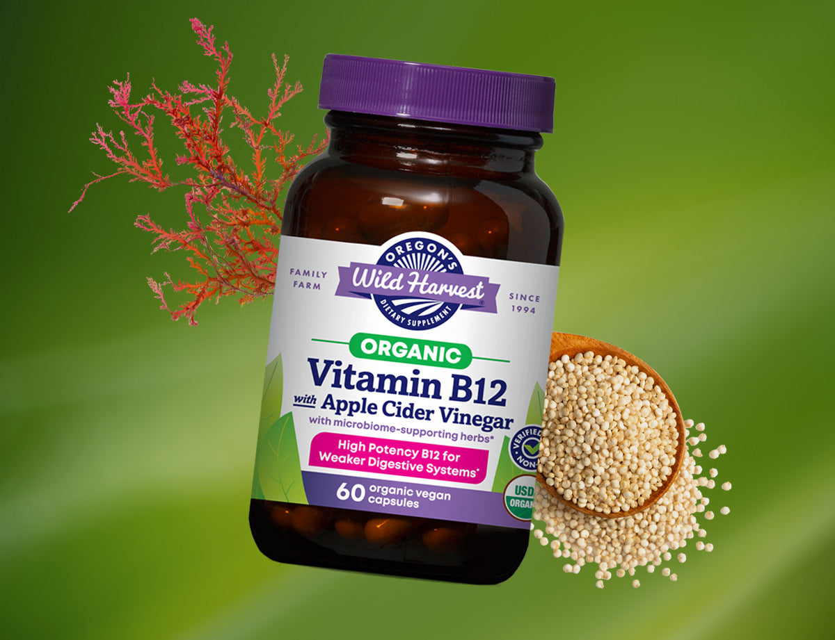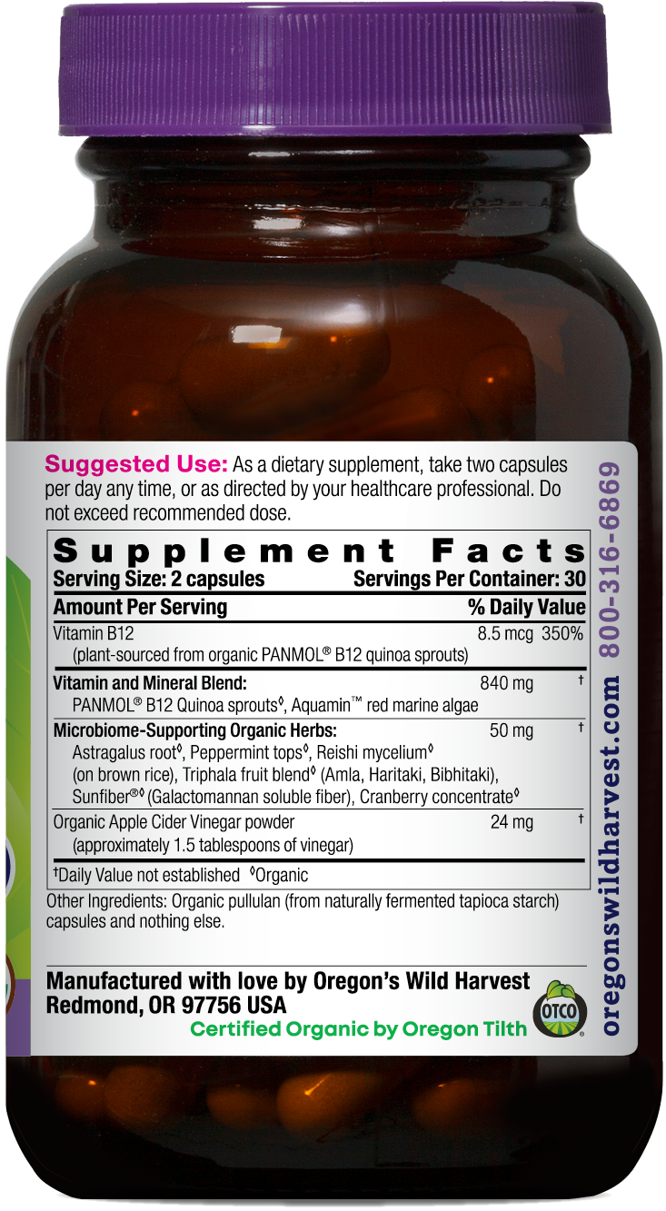 Vitamin B12 (plant-sourced from organic PANMOL® B12 quinoa sprouts), Vitamin and Mineral Blend (PANMOL® B12 Quinoa sprouts◊, Aquamin™ red marine algae◊), Microbiome-Supporting Organic Herbs (Astragalus root◊, Peppermint tops◊, Reishi mycelium◊ [on brown rice], Triphala fruit blend◊ [Amla, Haritaki, Bibhitaki], Sunfiber®◊ [Galactomannan soluble fiber], Cranberry concentrate◊), Organic Apple Cider Vinegar powder (approximately 1.5 tablespoons of vinegar), organic pullulan (from naturally fermented tapioca starch) capsules and nothing else.