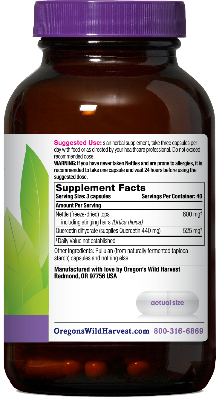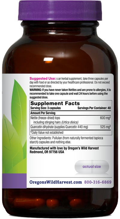 As an herbal supplement, take three capsules daily with food or as directed by your healthcare professional. WARNING: If you have never taken Nettles and are prone to allergies, it is recommended to take one capsule and wait 24 hours before using the suggested dose. Do not exceed recommended dose.